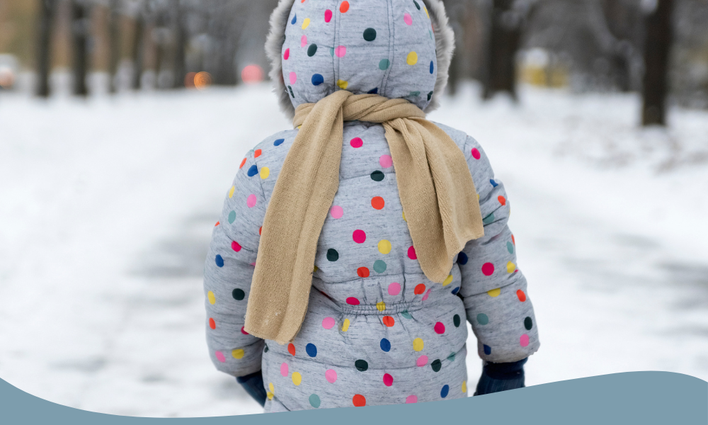 Barn i prickig vinteroverall och beige halsduk promenerar i snölandskap.